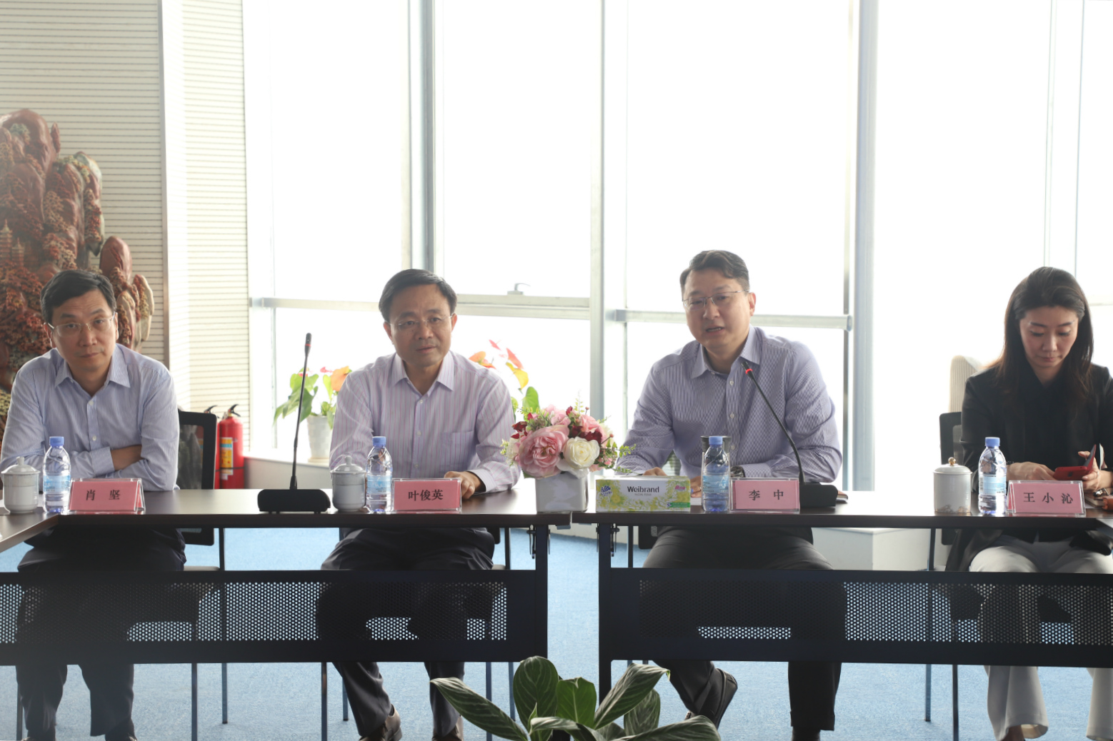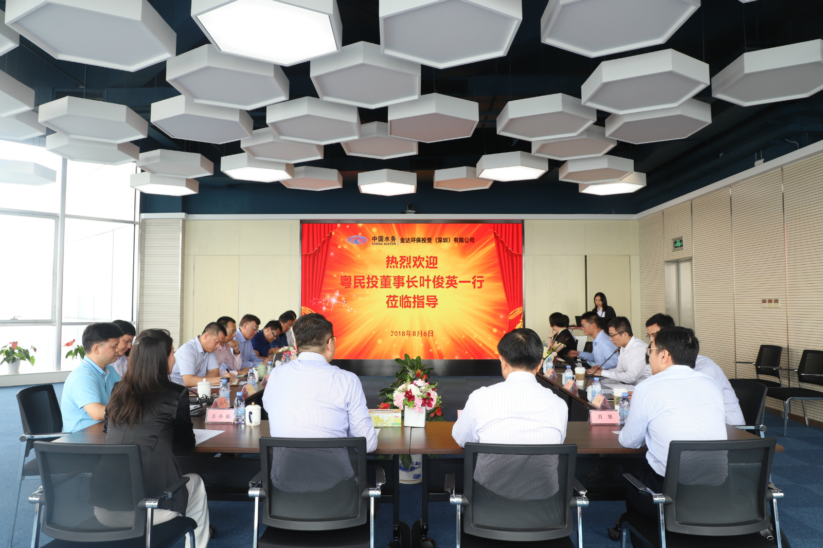 8月6日,粵民投董事長葉俊英、總經(jīng)理肖堅(jiān)、高騰控股總裁丁靚等一行5人蒞臨金達(dá)環(huán)??疾欤艿焦径麻L李中、副董事長王小沁、總經(jīng)理黃偉才等的熱情歡迎。